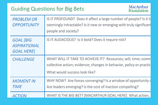 From DARPA's classic Heilmeier Catechism to ARPA(H)eilmeier Questions to MacArthur Foundation’s Big Bets guidelines