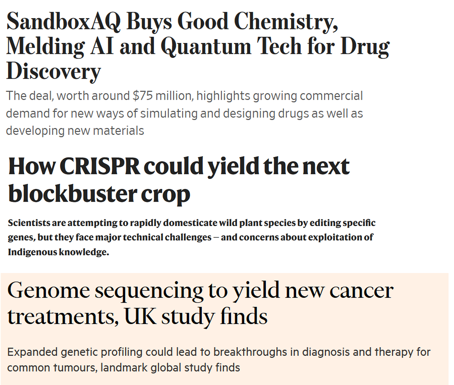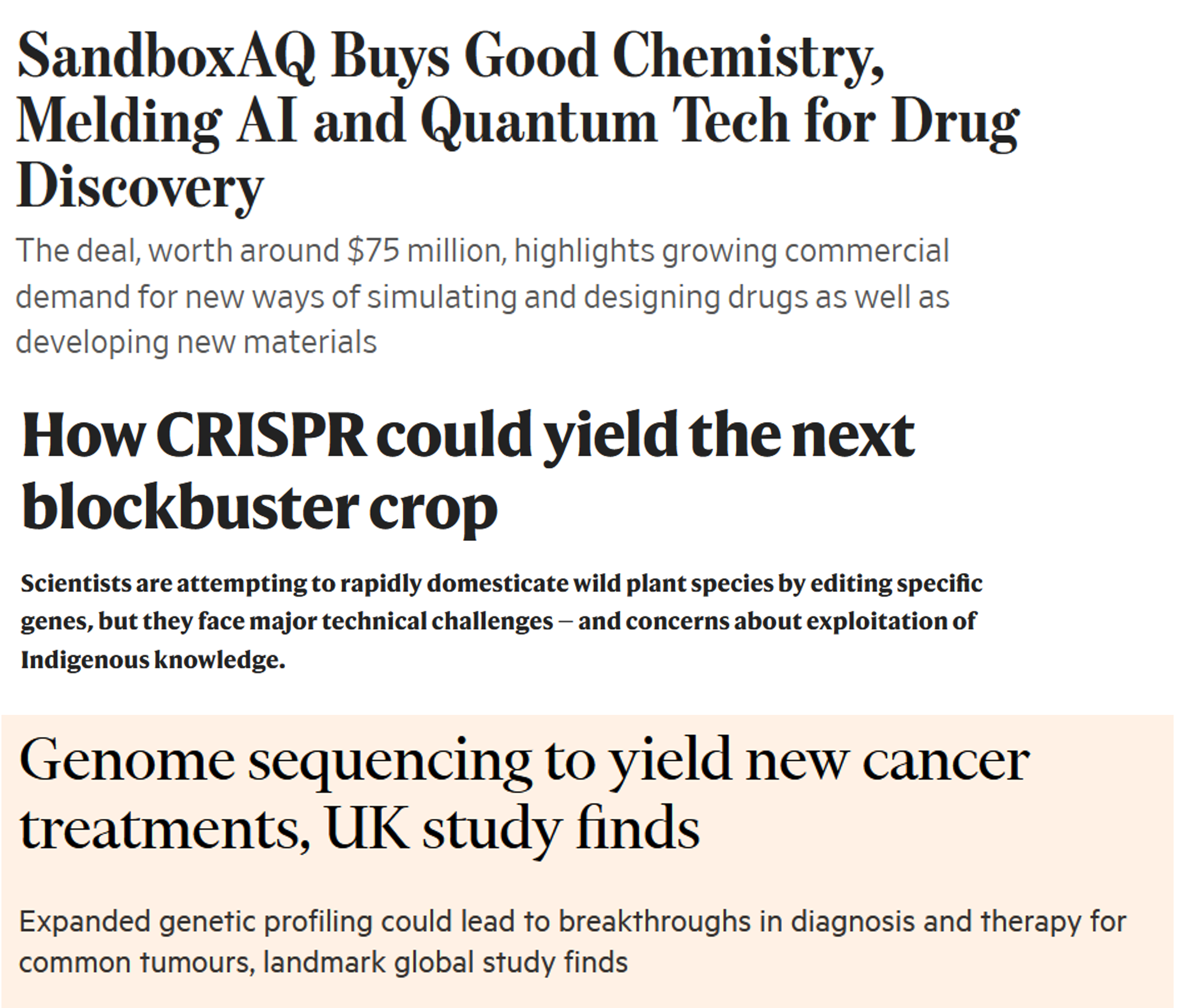 As a final point, alongside these breakthroughs in basic research, other teams and companies are actively delivering tools for applied and transformational researchers to build products. Some recent headlines reveal SandboxAQ acquiring Good Chemistry to make better quantum tools, scientists applying CRISPR tools to the complexity of domesticating new crops, and how genome sequencing may help find unique DNA signatures of common cancers. In short, these groups are the next part of the innovation pipeline, shepherding breakthroughs to the market and broader public.